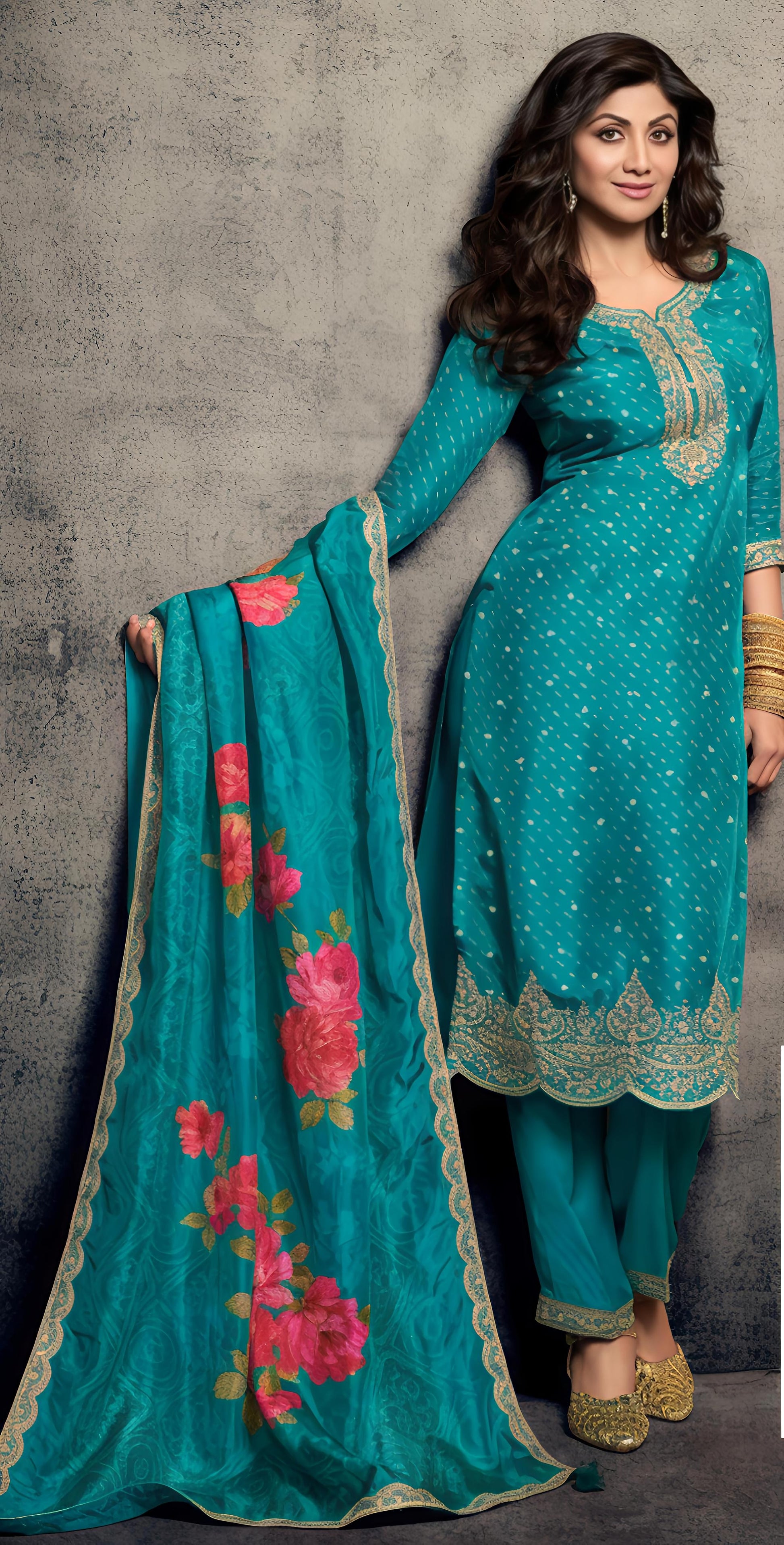 Elegant Russian Silk 3-piece suit set with zari work & floral digital print dupatta πΈπ